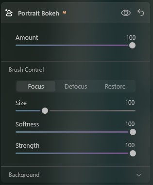 Portrait Bokeh: Amount to 100% to defocus the background. If needed fine tune the mask created in the mask option module