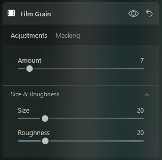 Film Grain(optional): Amount 7; Size 20; Roughness 20