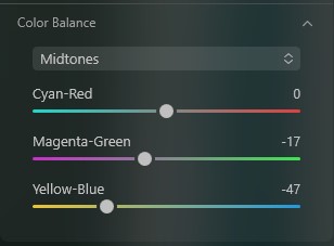 Midtones: 0 | -17 | -47 (Cyan-Red | Magenta-Green | Yellow-Blue)