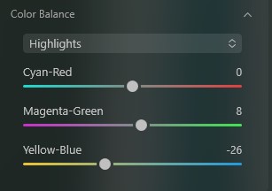 Highlights: 0 | 8 | -26 (Cyan-Red | Magenta-Green | Yellow-Blue)